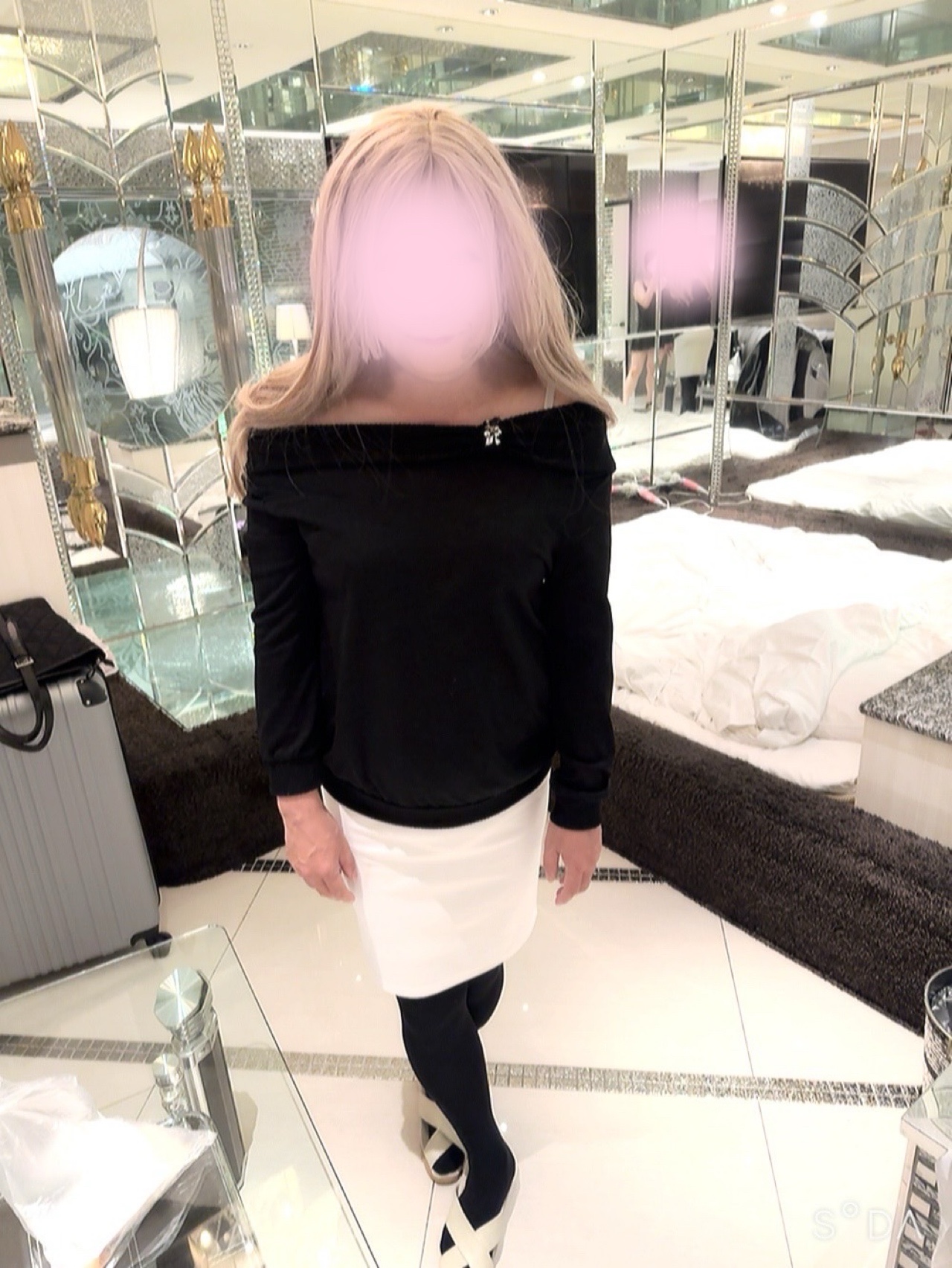 黒のオフショルニットと白のタイトスカートが似合う可愛いギャル😍