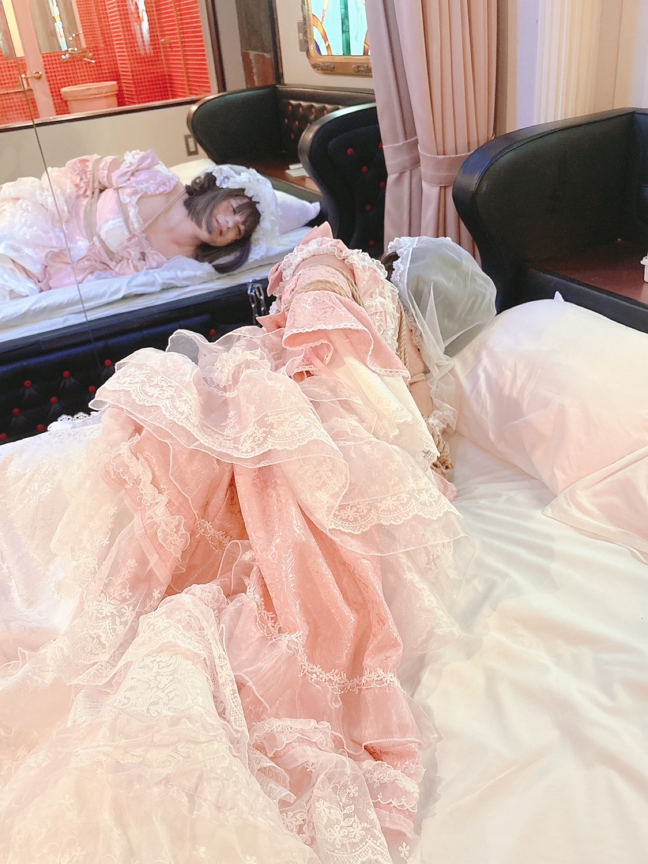 フリフリ豪華お姫様衣装に変身して鏡の前で。